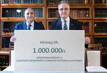 A Kőröstej Kft. egymillió forinttal támogatja a Sürgősségi Orvostanért a Debreceni Egyetemen Alapítványt. A cég tulajdonosa az adományt kedden adta át az alapítvány vezetőjének. A felajánlást a sürgősségi orvostannal kapcsolatos oktatási és kutatási tevékenység fejlesztésére fordítják.